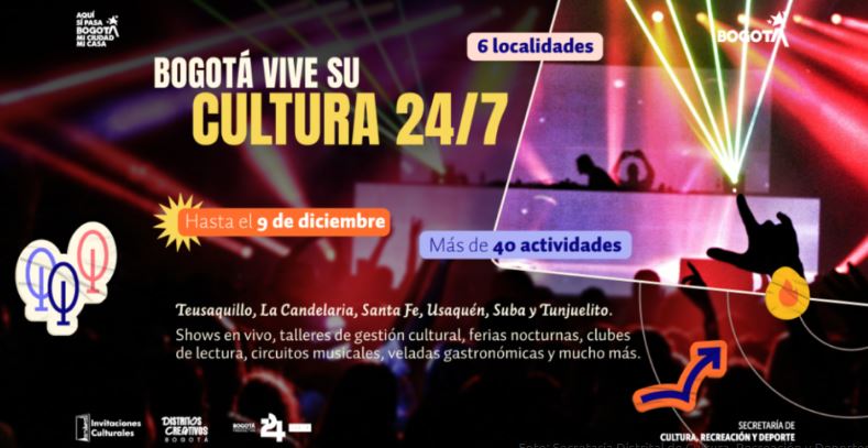 La Secretaría Distrital de Cultura, Recreación y Deporte impulsa la estrategia Territorios Vivos 24/7, una iniciativa que fortalece la vida cultural nocturna en Bogotá mediante 20 circuitos culturales activos entre 2024 y 2027. Como parte de esta apuesta, la ciudad cuenta hasta el 9 de diciembre con una agenda de más de 40 actividades que incluyen recorridos nocturnos, talleres, ferias, shows en vivo, laboratorios creativos, clubes de lectura y veladas gastronómicas en las localidades de Usaquén, Santa Fe, La Candelaria, Suba y Tunjuelito.