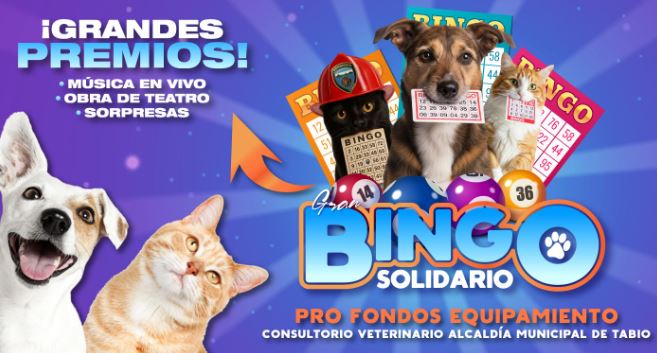 La Veeduría por la Dignidad y Protección Animal de Tabio (DPAT), en coordinación con la Alcaldía Municipal y el Cuerpo de Bomberos Voluntarios, invita a la comunidad al Gran Bingo Solidario, cuyo objetivo es equipar el consultorio veterinario de la administración municipal.