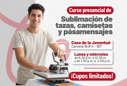La formación se desarrollará los lunes y miércoles en la Casa de la Juventud, ubicada en la carrera 18 #4–187, en jornada de 8:30 a.m. a 12:30 m. y de 1:30 p.m. a 4:00 p.m. Está dirigida a personas mayores de 14 años interesadas en aprender técnicas de personalización de productos.